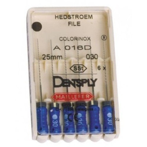 Рабочая часть Н-файлов № 30 Dentsply изготовлена из специальной нержавеющей стали со спиралевидными ребрами. Ручка сделана из пластика и надежно удерживается, для контроля длины используются силиконовые стопперы.